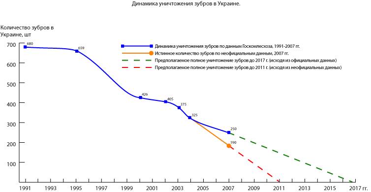 За 15 лет независимости Украина утратила две трети поголовья зубров. Из шестиста шестидесяти четырех имевшихся в 1991 году зубров на 2007 год по официальным данным сохранилось только 255, а по информации из независимых источников – 190-230.