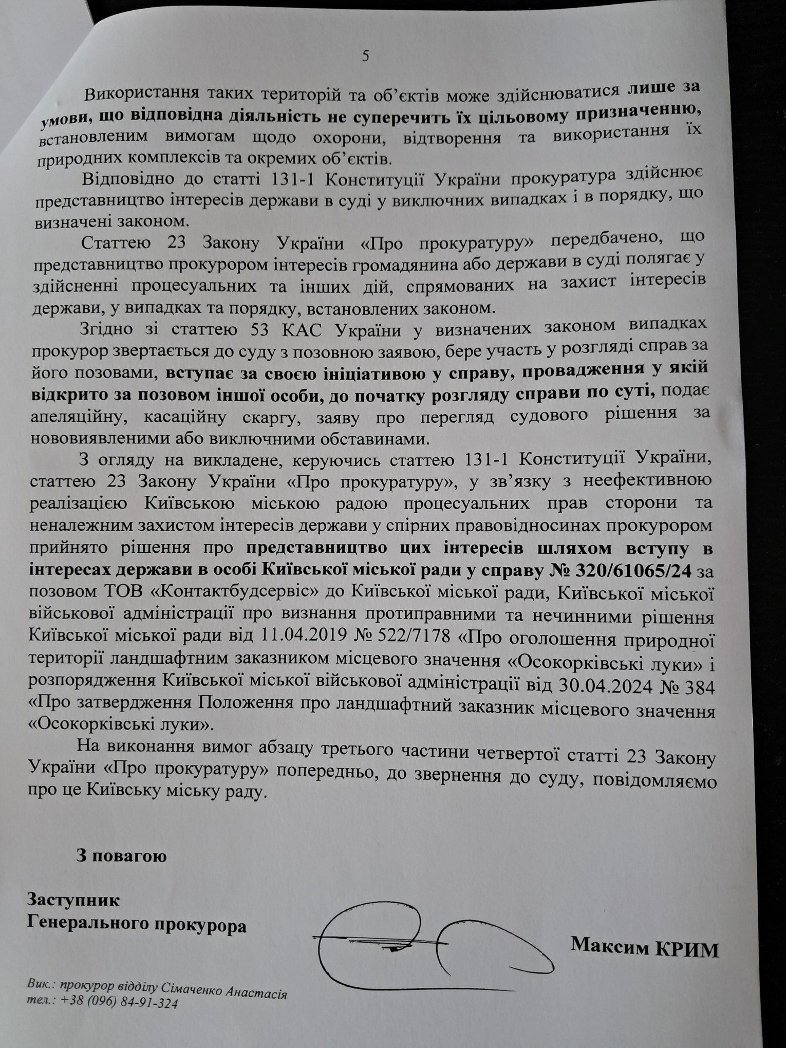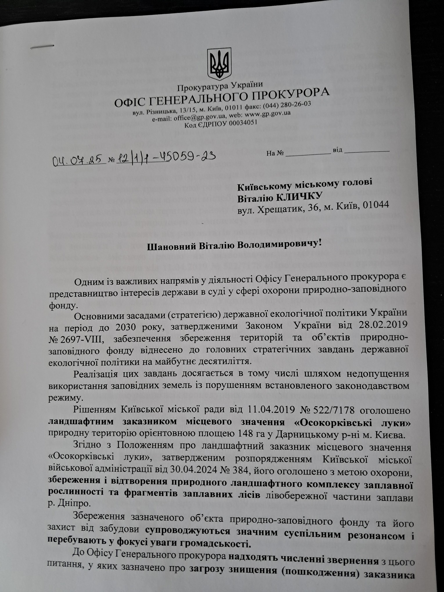 І ось новий кричущий приклад. 4 липня 2025 р. заступник Генерального прокурора України Максим Крим звернувся до Кличка з офіційним листом, в якому звинуватив Київраду в небажанні якісно, на ділі захищати в суді київський заказник “Осокорківські луки” від закриття.