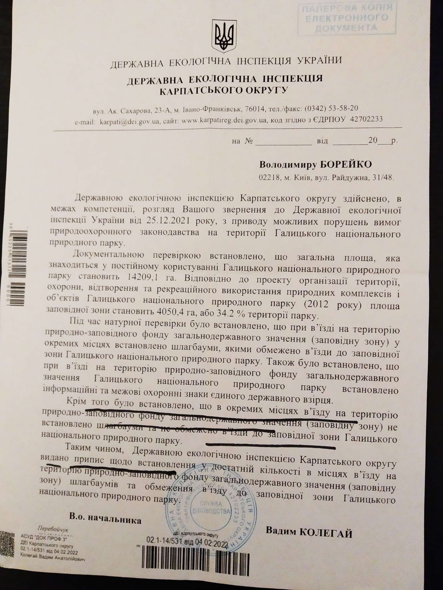 Теперь- Галицкий национальный парк в Ивано-Франковской области, где Киевский эколого-культурный центр тоже обнаружил нарушение этого Закона. Выявленные нами факты были подтверждены проверкой Госэкоинспекции. Госэкоинспекция выдала предписание руководству парка на устранение данного нарушения.