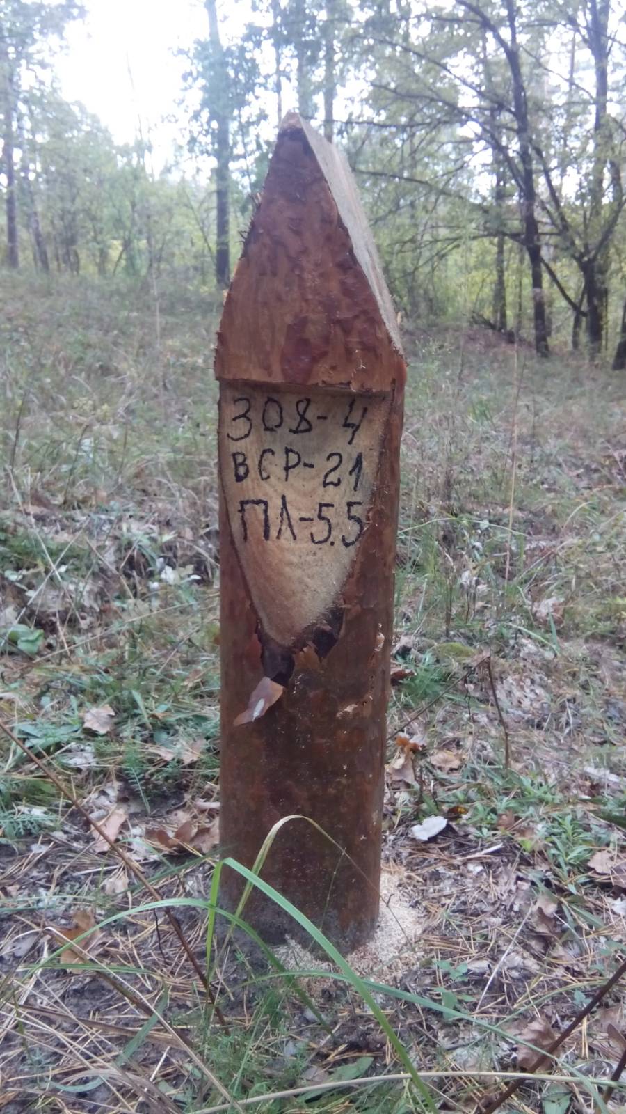Лесохозяйственный столбик четко указывает место незаконной рубки
