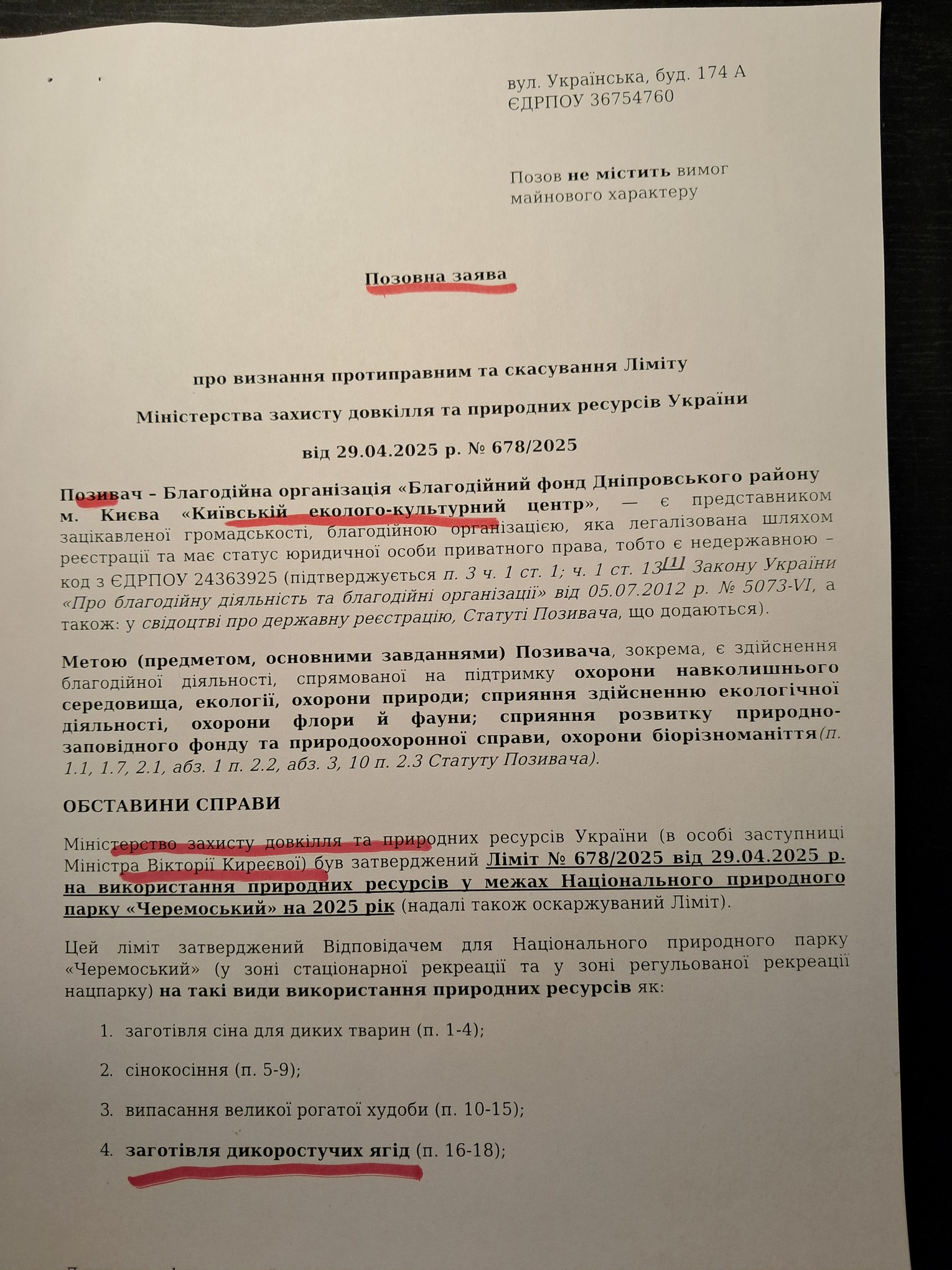 Київський еколого-культурний центр ( КЕКЦ) подав вже 3 судовий позов до Київського окружного адміністративного суду на Міністерство економики, довківлля та сільського господарства України. КЕКЦ звинувачує Міністерство у видачі незаконних лімітів на заготівлю у промислових масштабах ягід та грибів у національних парках.