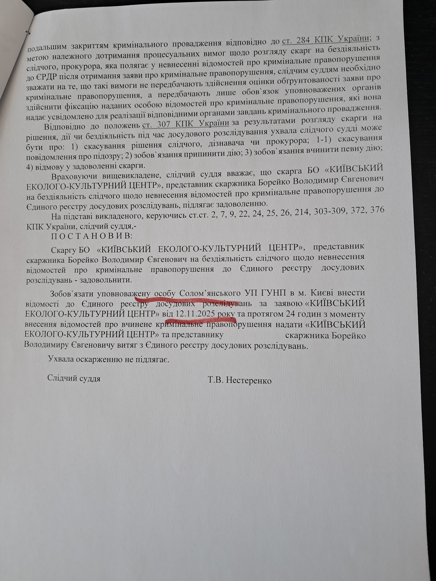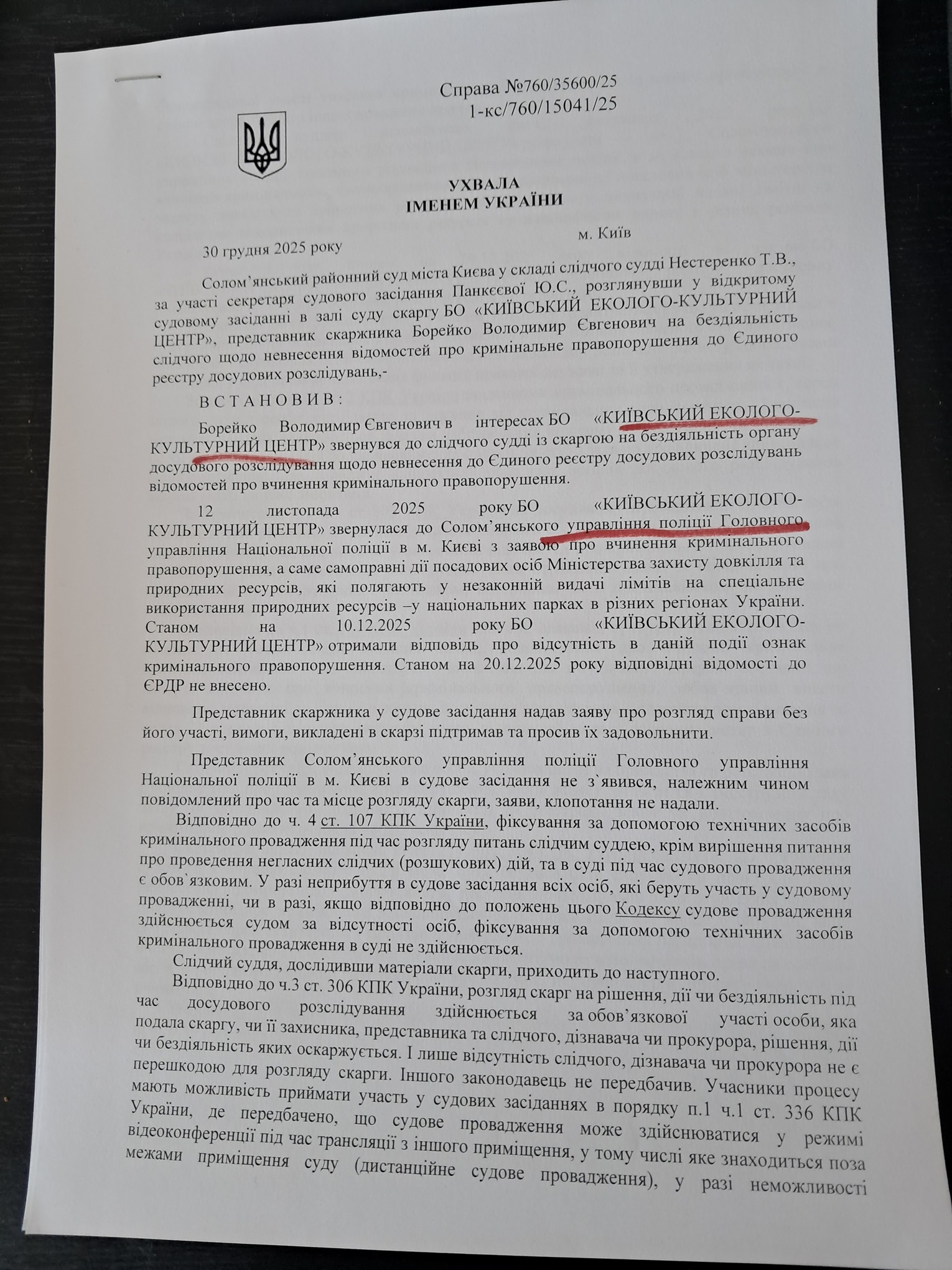 Вивчив справу, суддя Солом,янского  районного суду Т.Нестеренко   задовольнила скаргу  КЕКЦ на бездіяльність поліції щодо невнесення відомостей про кримінальне правопорушення , і зобов,язала упововажену особу Солом,янського  УП ГУНП в м. Києві внести відомості  до  Єдиного реєстру  досудових розслідувань, тобто відкрити кримінальну справу проти  керівництва Мінекономіки і довкілля за  видачу незаконних лімітів  на заготівлю очерету в нацпарках.