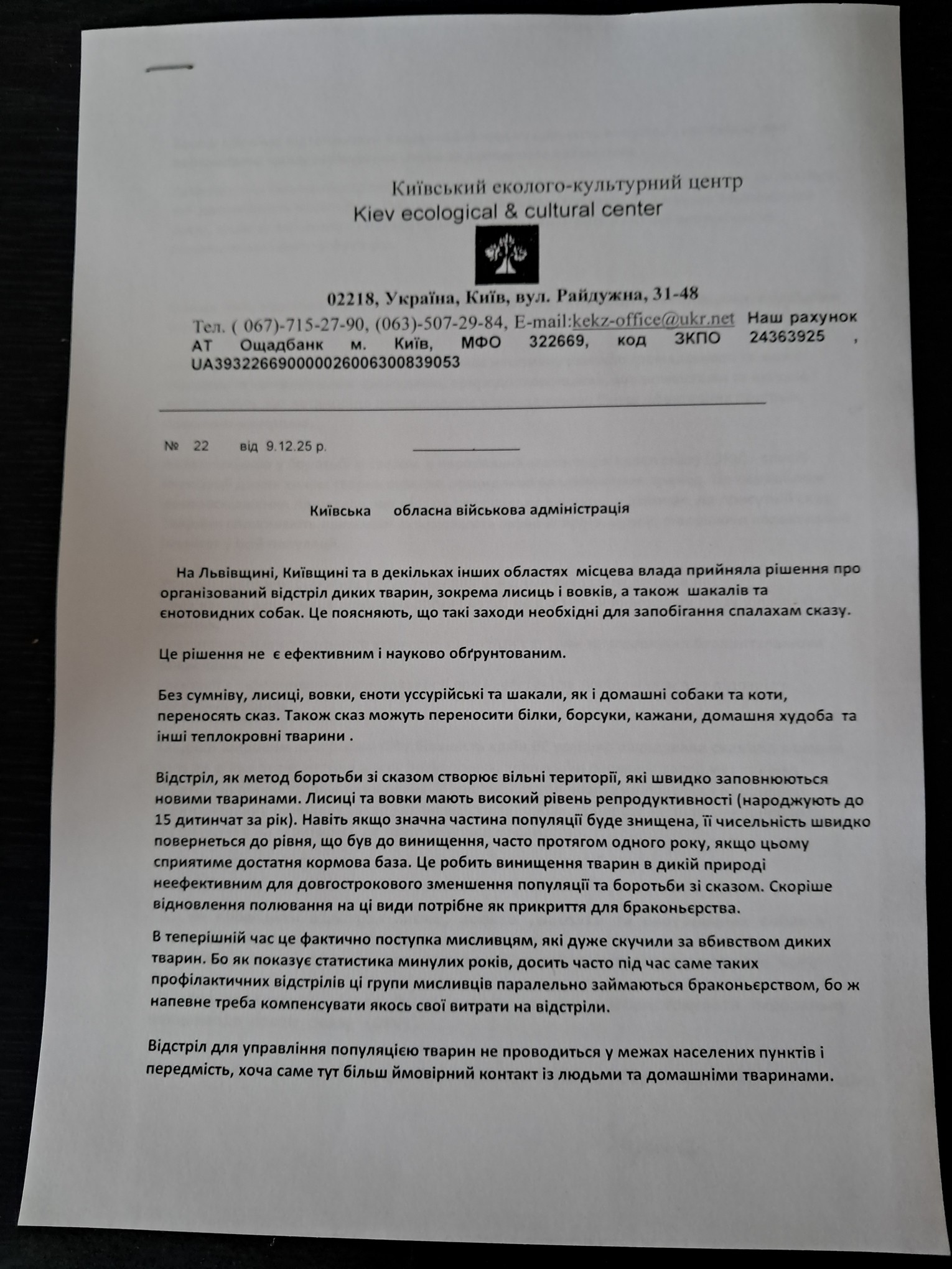 Звернення КЕКЦ у Київську обласну військову адміністрацію