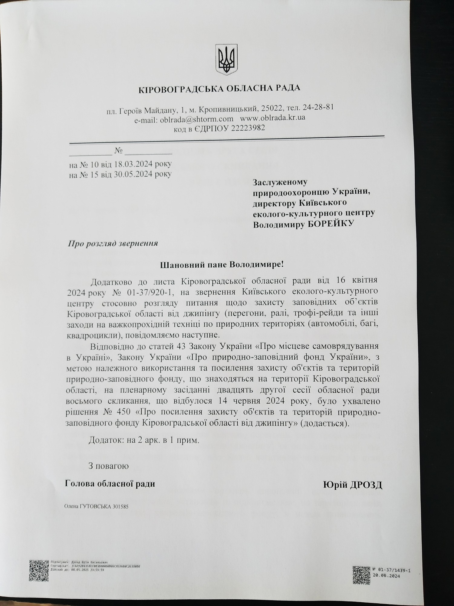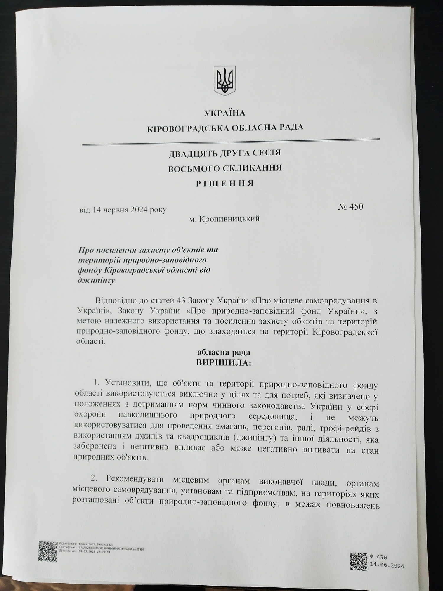 На фото= Рішення Кіровоградської обласної ради про заборону джипінгу