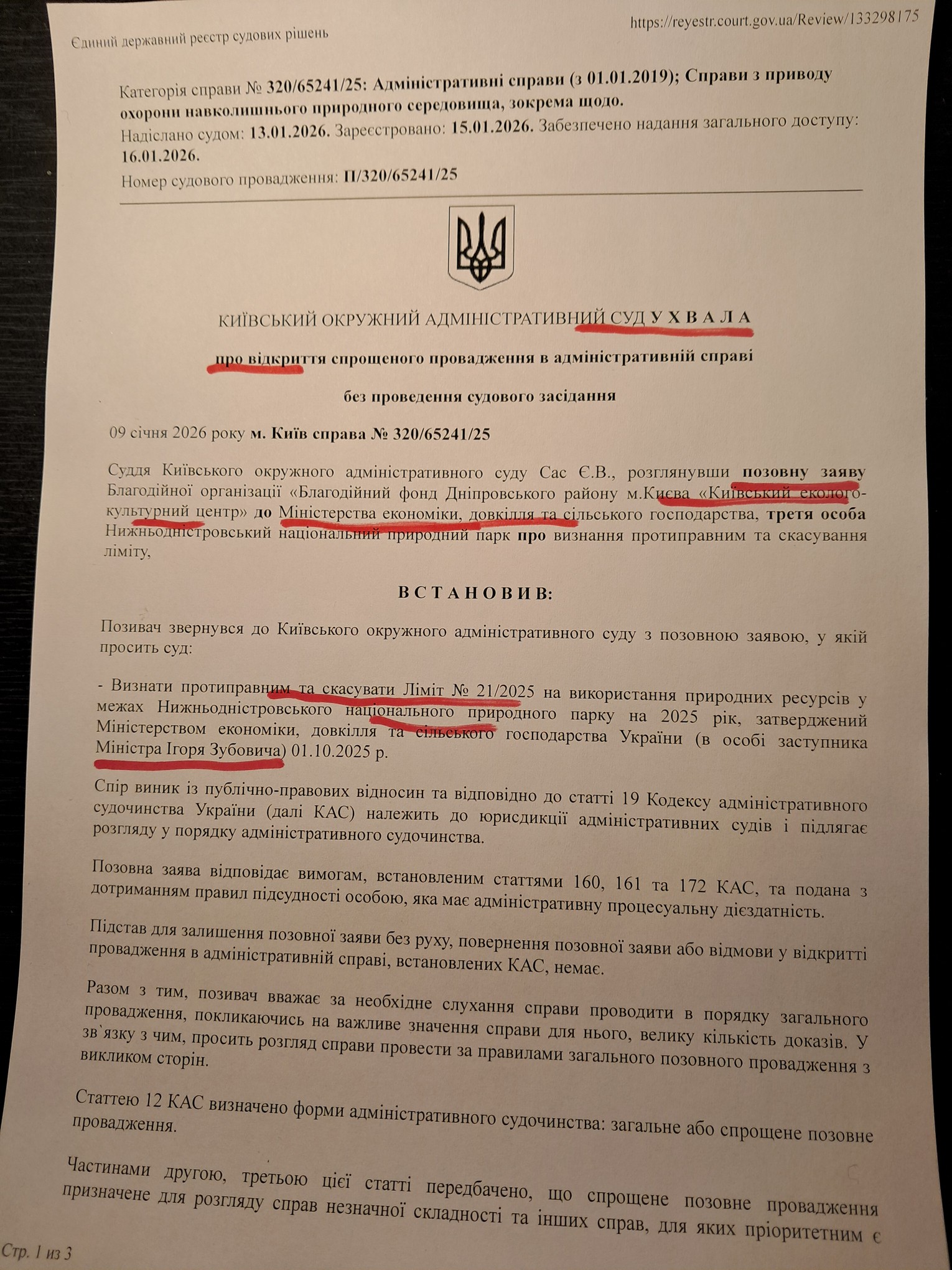 Міністерства економіки, довкілля та сільського господарства, третя особа Ніжньодністрвоский національний природний парк,   відкрив судову справу проти Міністерства  економики та довкілля в особі заступника міністра І.Зубовича . КЕКЦ звинувачує І.Зубовича у  за видачі незаконніх лімітів  на заготівлю очерету  національним паркам.