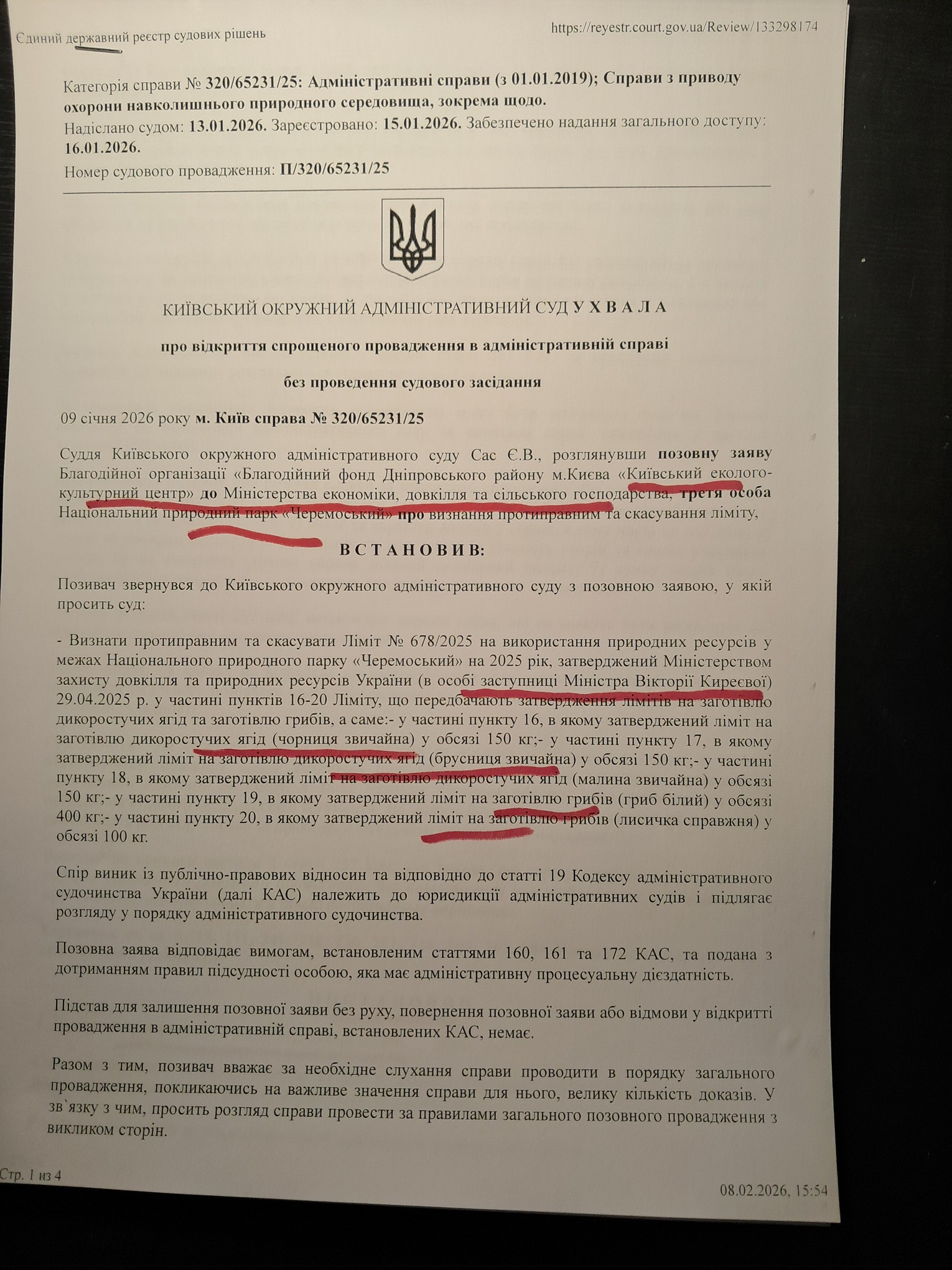 Київський окружний адміністративний суд по позову Київського еколого-культурного центру ( КЕКЦ ) відкрив судову справу проти заступника міністра Мінжолвкілля В.Киреєвої за видачу незаконного ліміту на заготівлю грибів та ягід у національних парках. Щорічно національним паркам видається ліміт на заготівлю приблизно 200 тонн ягід, та на заготівлю приблизно 100 тонн грибів.