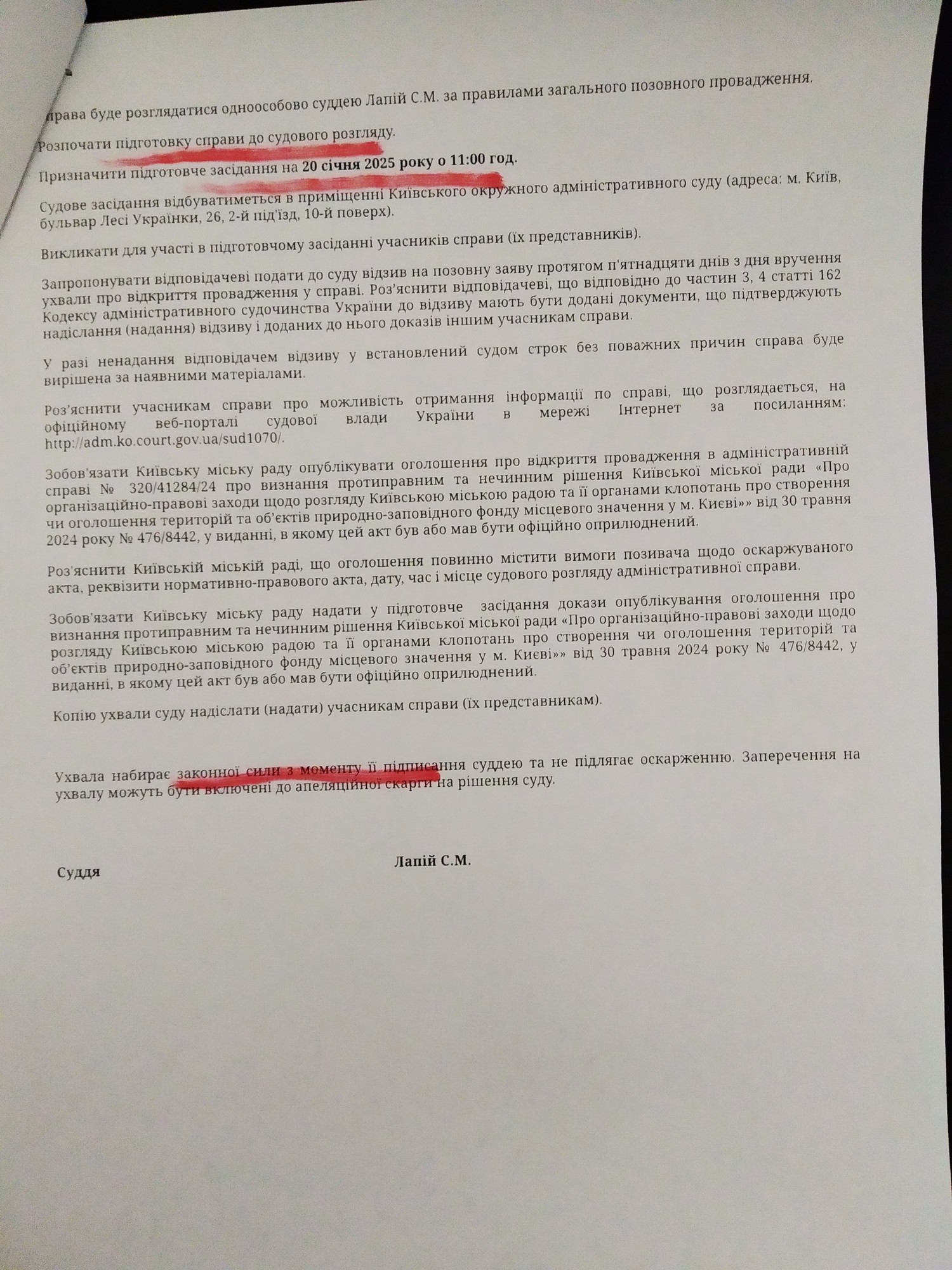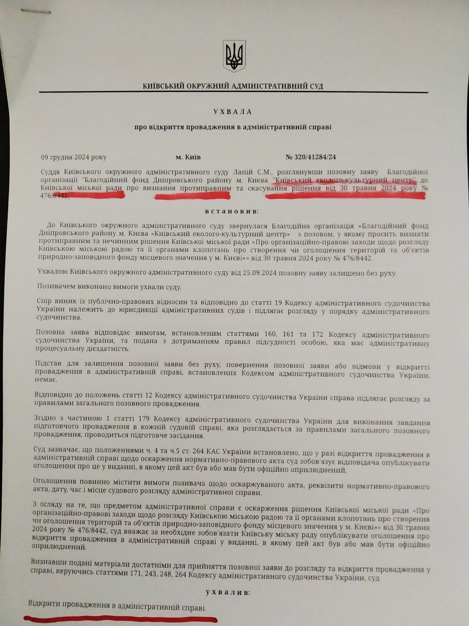 Київський окружний суд за позовом Київського еколого-культурного центру (КЕКЦ ) розпочав судову справу проти Київради. 30 травня 2024 р. Київрада прийняла незаконне рішення , яким було заблоковано створення нових заповідних об,єктів у Києві. Крім того це рішення порушило низку Законів України- « Про природно-заповідний фнд України», « Про місцеве самоврядування «, « Про засади державної регуляторної політики у сфері господарської діяльності». Це рішення було розроблено секретарем Київради Бондаренко и депутаткой-« ударівкой» Лимар,і як ми вважаємо, по заказу забудовників. Завдяки цьому рішенню за півроку Київрадою не було заповідано жодної зеленої зони або водойми ,що дає забудовникам чудову можливість їх забудовувати.