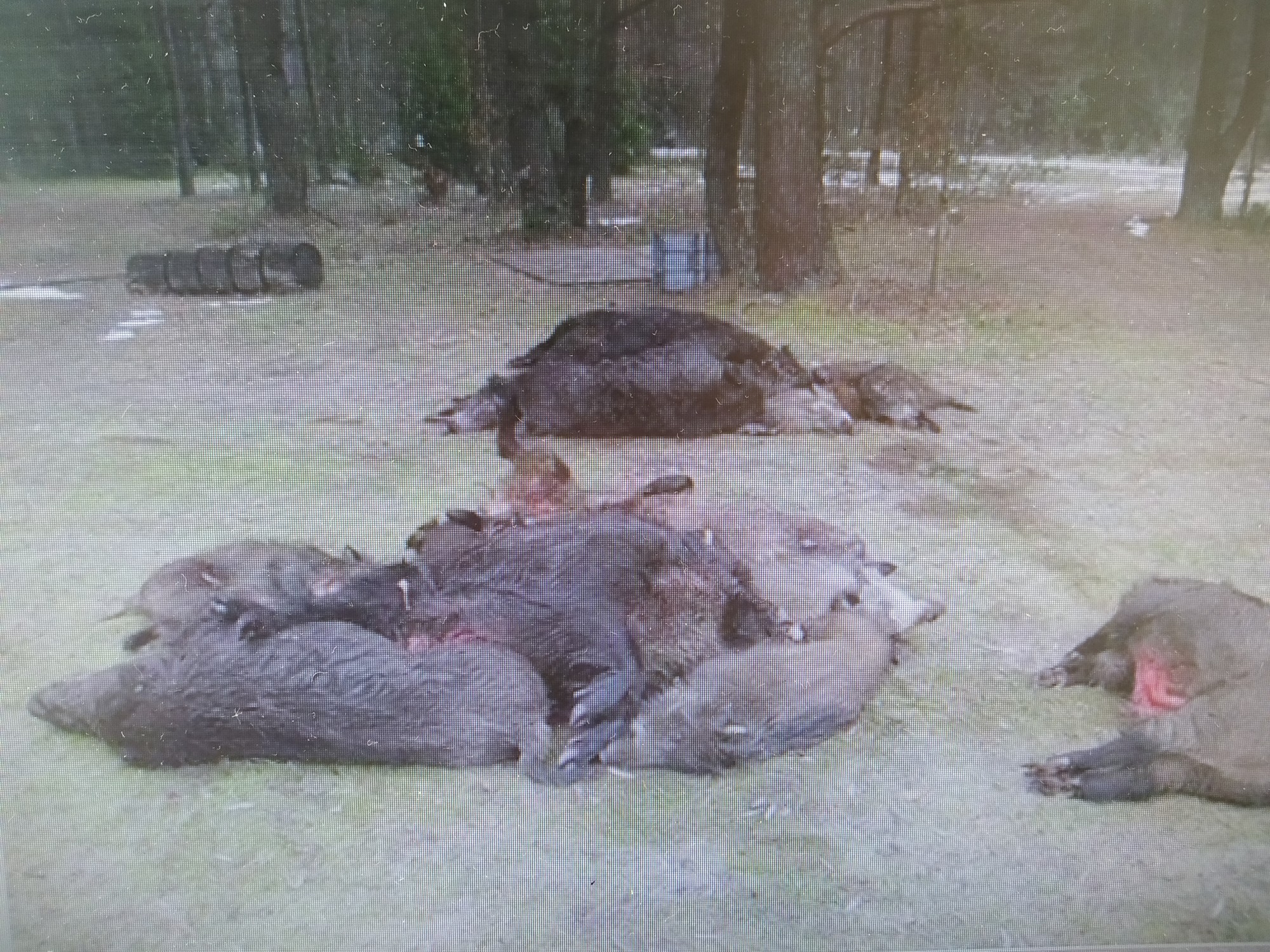 Убитые охотниками кабаны со вспорытыми брюхами валяются на дорожках в национальном парке Беловежская пуща.