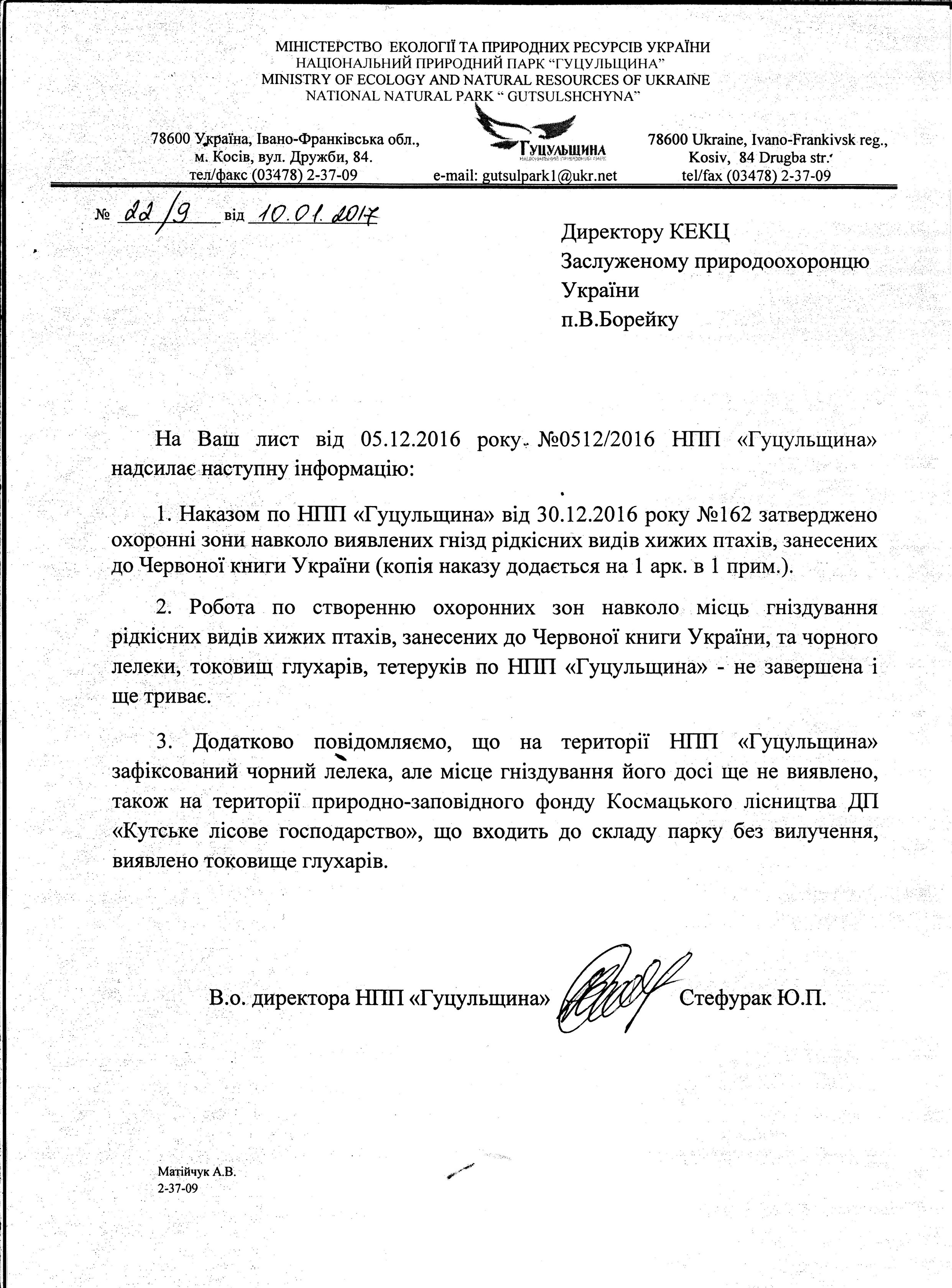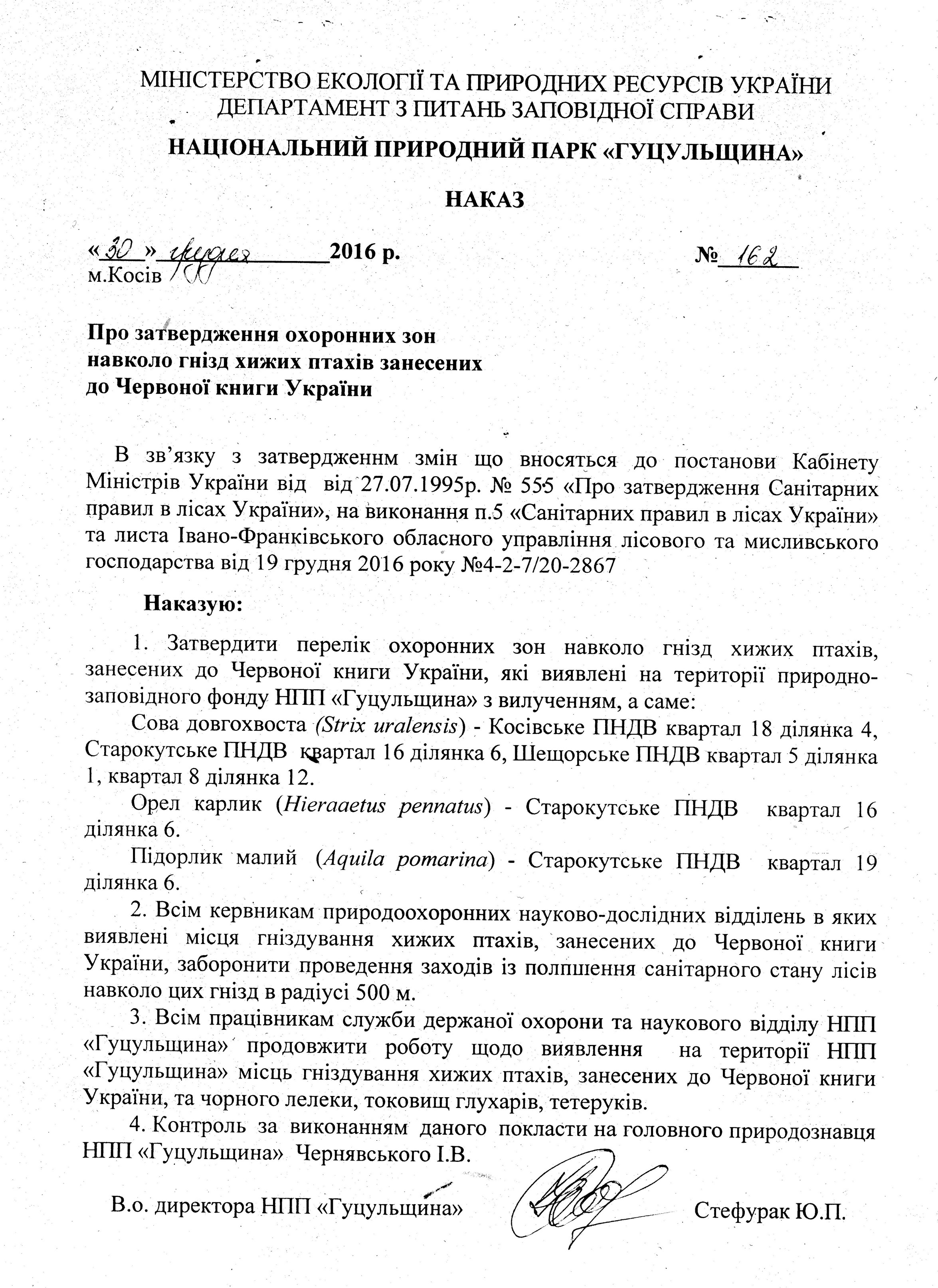 Кампания, начатая Киевским эколого-культурным центром и Украинским обществом охраны птиц по созданию охранных зон вокруг гнезд и других мест обитания редких видов птиц в Украине продолжается. 30 декабря 2016 г. г. врио. директора национального парка Гуцульина Ю.Стефурак утвердил приказом охранные зоны вокруг мест обитания редких видов птиц. Под охрану взято 3 гнезда длиннохвостой неясыти, 1 гнездо малого подорлика, 1 гнездо орла-карлика, всего 5 мест обитания редких птиц. Таким образом на сегодняшний день охранные зоны создали национальные парки= Гуцульщина, Синевир, Сколевские Бескиды, Галицкий, Гомольшанские.леса, а также РЛП Межреченский и Киевское обастное управление лесного хозяйства.