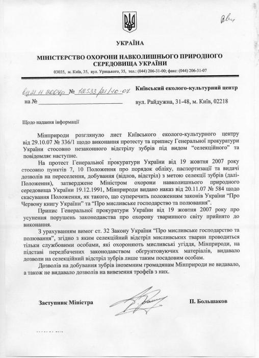 20 ноября 2007 года Министерство природы Украины, на выполнение предписаний Генпрокуратуры, отменило действие своего Положения про порядок учета, паспортизации и выдачи разрешений на переселение, добычу (отлов, отстрел) с целью зубров от 19.12.1991 г. (текст приказа Минприроды, а также письма из Минприроды в КЕКЦ)