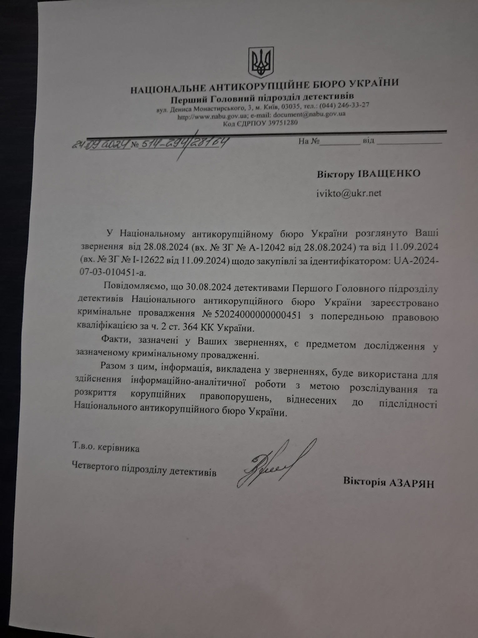 Відповідь НАБУ про порушення кримінальної справи