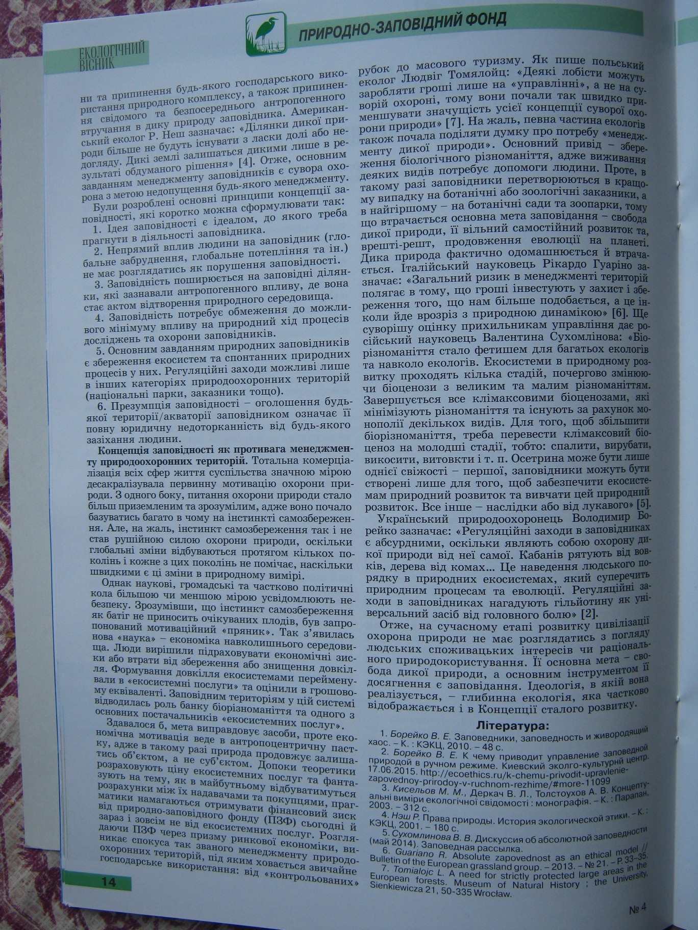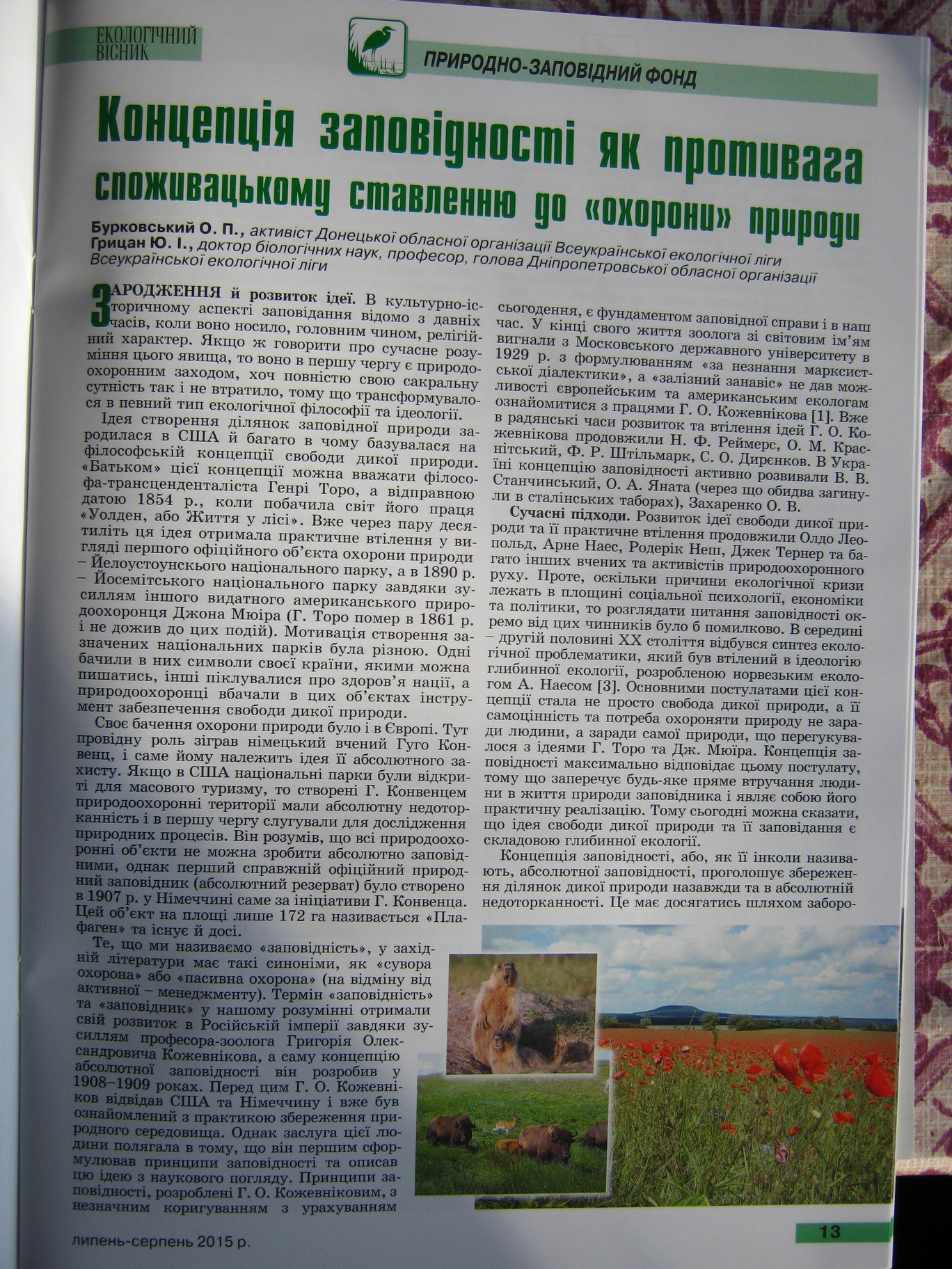 Украинский журнал “Екологічний Вісник”, липень-серпень, 2015 №4 (91) ,опубликовал очень важную статью известного украинского активиста заповедного дела А.Бурковского и д.б.н. Ю. Грицана “Концепция заповедности как противодействие потребительскому отношению к “охране” природы”