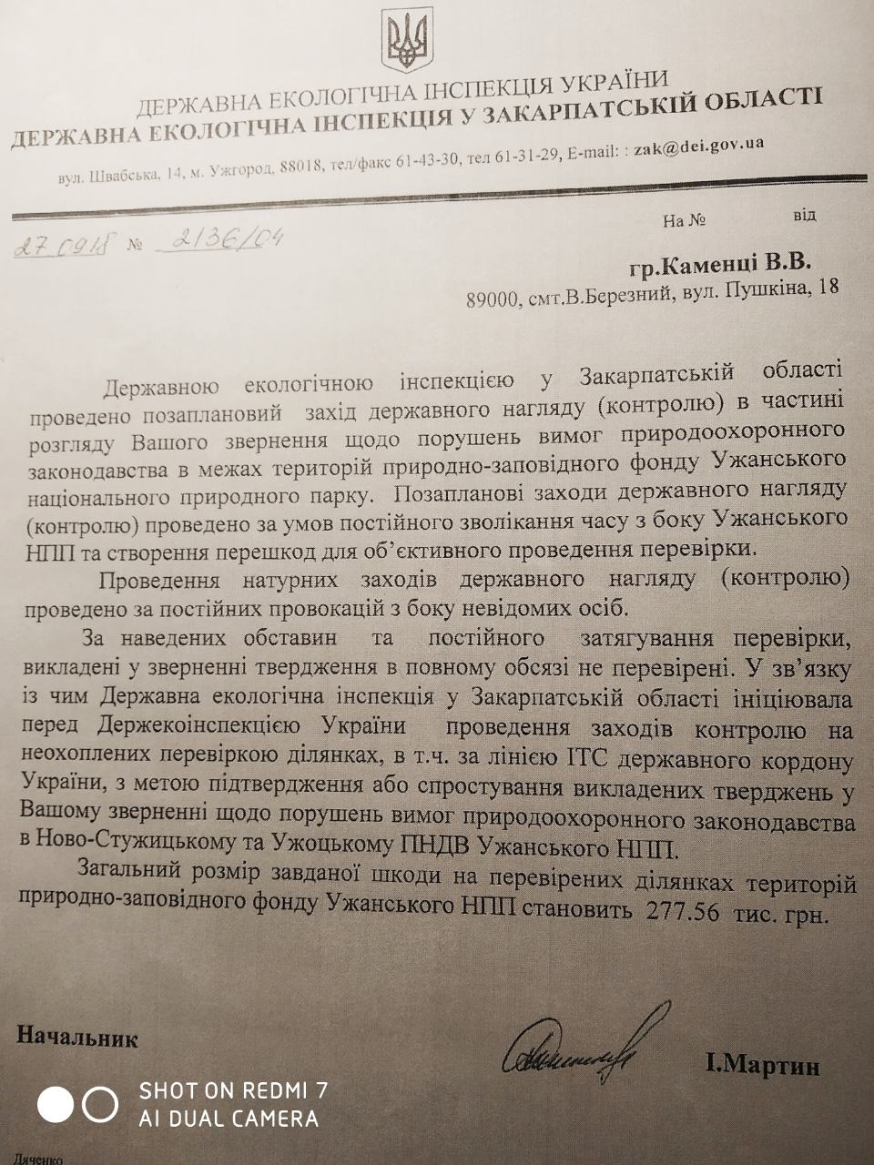 Відповідь Держекоінспекції громадянину Каменці, в якій повідомляється про перешкоди з боку дирекції парку при проведенні перевірки