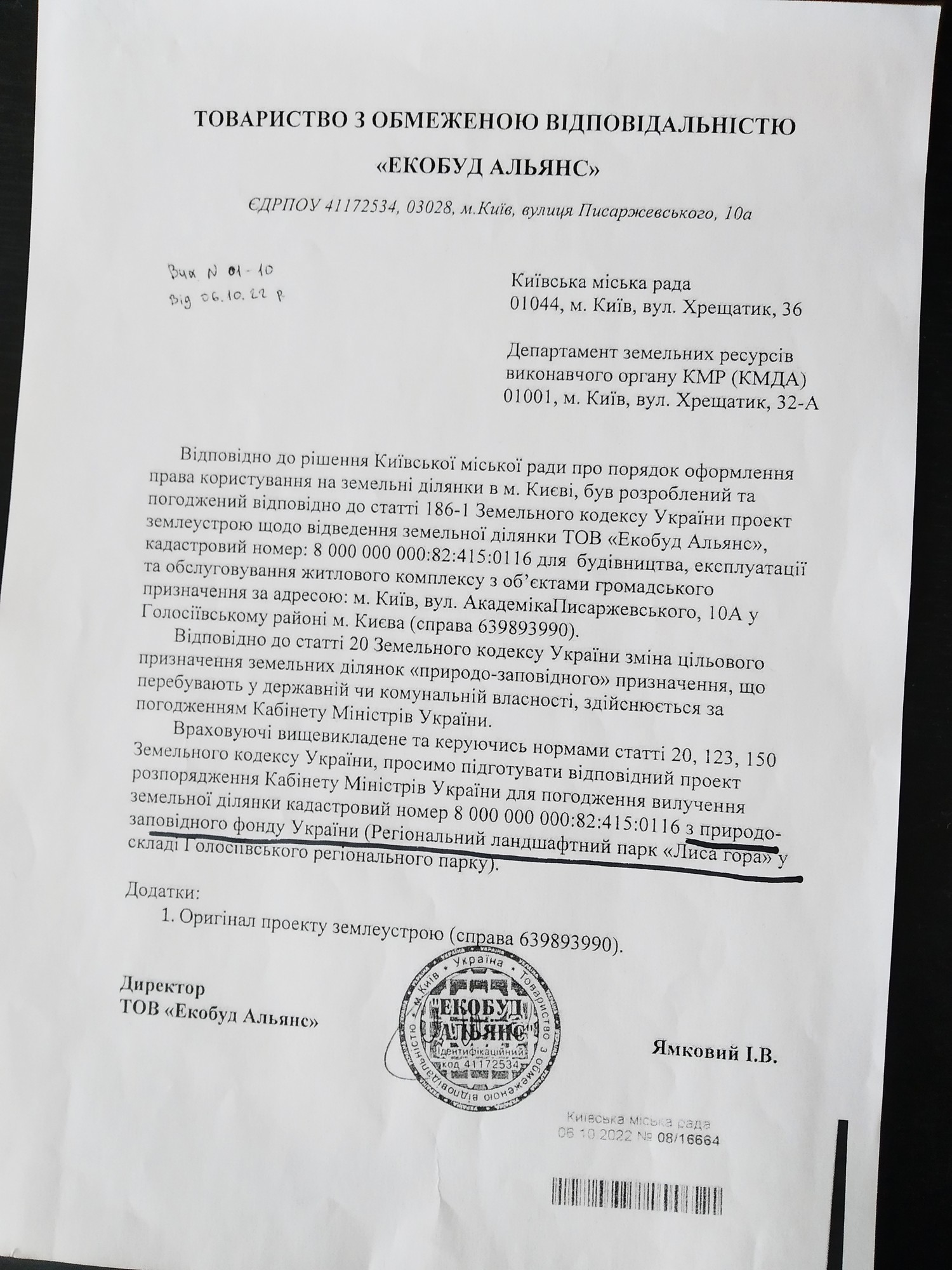 По-друге, деякі київські забудовники, як, наприклад, ТОВ «Екобудальянс» ще 6 жовтня 2022 р. звернулися до Київради з пропозицією зняти заповідний статус з Лисої гори, щоб розпочати там будівництво житлового комплексу (див. фото до цьго поста).